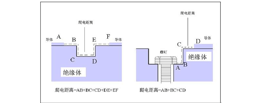 - 爬电距离是指沿绝缘表面测得的两个导电零部件之间或导电零部件与设备防护界面之间的最短路径 ;