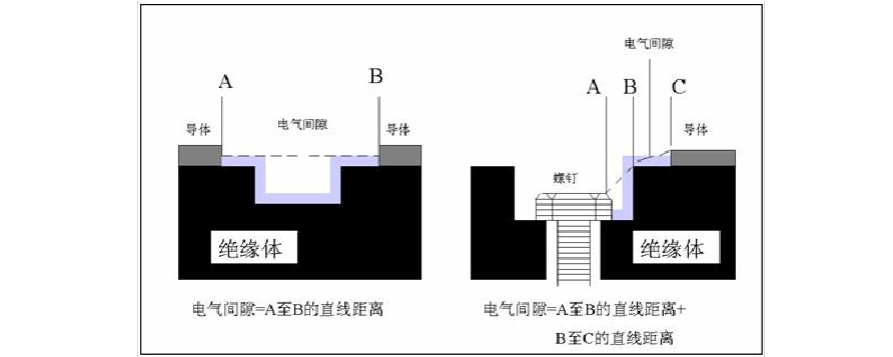 - 电气间隙是指在两个导电零部件之间或导电零部件与设备防护界面之间测得的最短空间距离,即通过空气能实现绝缘的最短距离;